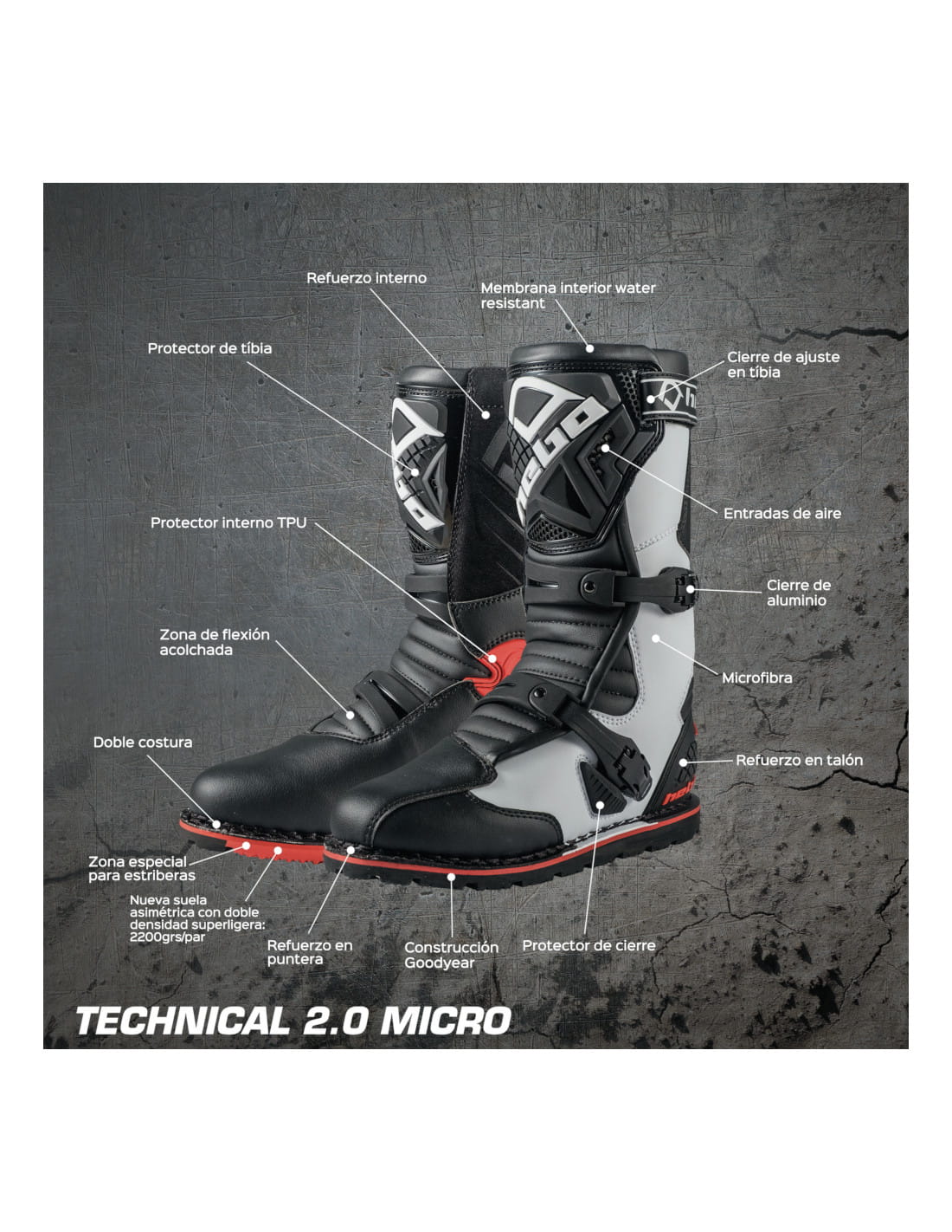 podwójnej gęstości 2200 g / para. Pochodzi z odporną na działanie wody membraną wewnętrzną, ochraniaczem i zamknięciem dopasowanym do kości piszczelowej, wlotami powietrza, aluminiowym zapięciem i wzmocnieniem pięty. Wyściełana strefa flex i wewnętrzny ochraniacz TPU zapewniają większy komfort i odporność. DOSTĘPNE ROZMIARY 43 44 45