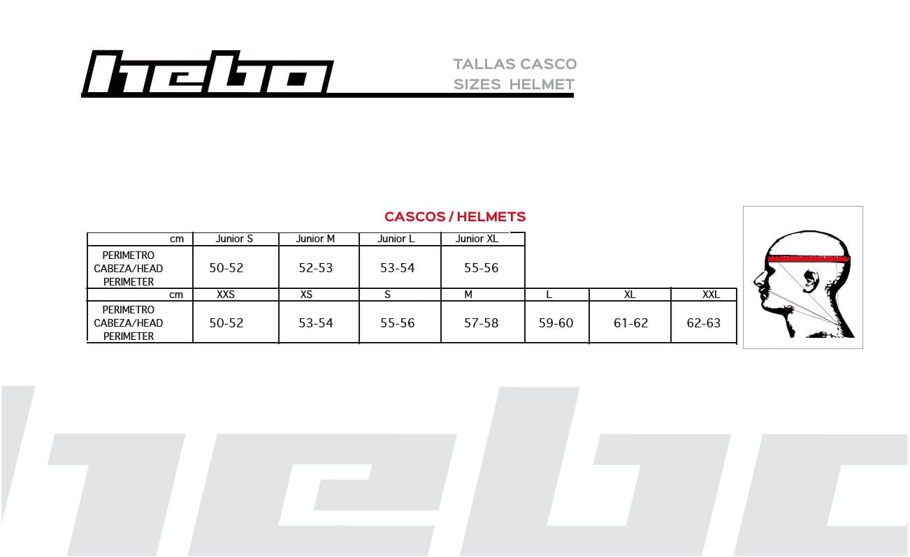 Kask wykonany z włókna szklanego o wysokim module EPS: Wykonane ze spienionego polistyrenu w trzech gęstościach z dwoma wewnętrznymi miarami EPS. Wnętrze : w pełni wyjmowane. Wykonany z laminowanej pianki o różnej gęstości, pokrytej hipoalergicznym materiałem COOLMAX® dla idealnego komfortu. ZAMYKANIE: regulowane szybkie zamykanie mikro napędu WYŁĄCZNIE od HEBO® CHŁODZENIE: dwa z przodu i dwa u góry ze zdejmowanymi pokrywami i czterema tylnymi wylotami wentylacyjnymi, zapewniającymi wewnętrzne chłodzenie między EPS a skorupą, tworząc w środku uczucie chłodu. VISOR: Wykonany z odpornego tworzywa ABS, ekskluzywne śruby boczne Hebo® wykonane z aluminium. Homologacja europejska 22 do -05 WE. WŁÓKNO SZKLANE dla wszystkich rozmiarów. WAGA: 950 ± 50 gr. KASK HEBO TRIAL ZONE 4 PATRIK BLUE ROZMIARY KASKU XS S M L XL