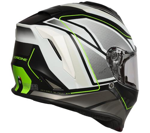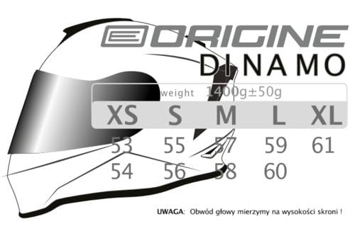 ORIGINE DINAMO GALAXI WHITE-BLACK MATT M Dinamo to solidny kask za rozsądne pieniądze. Rozbudowany system wentylacji oraz przedni deflektor zapewnia komfort w każdych warunkach. Nie straszny mu deszcz i palące słońce. Kask zapewnia ochronę UV a do tego wizjer jest odporny na zarysowania. Mikrometryczne zapięcie pozwala w łatwy sposób zapiąć czy rozpiąć kask także w rękawiczkach motocyklowych. Aby zapewnić maksimum higieny wyściółkę można z łatwością wyjąć i wyprać. WŁAŚCIWOŚCI Skorupa z włókna termoplastycznego Wyściółka nadaje się do prania Wyjmowana wyściółka System wentylacji Homologacja ECE 22-05 Zapięcie mikrometryczne Ochrona UV Wizjer odporny na zarysowania ROZMIARY XS (53-54cm) S (55-56cm) M (57-58cm) L (59-60cm) XL (61cm)