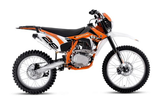 Model I MARKA : Barton nxt 250 Silnik: 250cc, 1 cylinder, 4-suw Skrzynia Biegów: manualna, 5 biegów (1-N-2-3-4-5) MAX.Moc: 26KM Rozruch: elektryczny i nożny Napęd: Łańcuch, rolka, prowadnica łańcucha Hamulce: hydrauliczne: HYDRAULICZNE tarcza przód, tarcza tył Zawieszenie przód: UPSIDE DOWN Zawieszenie tył: amortyzator na kiwaku, REGULOWANY ! GAZOWY ! Wymiary: dł./szer./wys.: 2100 x 810 x 1300 mm Wysokość siedziska: 880mm Opona przód: 80 / 100 - 21" Opona tył: 110 / 90 - 18" Masa własna: 115kg Pojazd nie posiada homologacji, więc nie jest dopuszczony do ruchu po drogach publicznych.