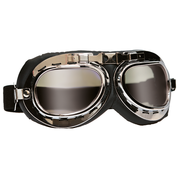 Okulary retro. Chromowany metalowy uchwyt. · Wygodna i miękka w dotyku ochrona piankowa. · Regulowana elastyczna gumka do umieszczenia w dowolnym kasku.