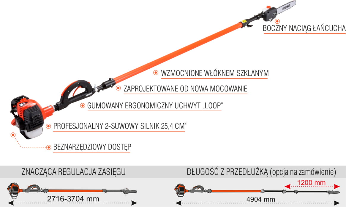 Pilarka na wysięgniku ECHO PPT-2620ES SILNIK - dane techniczne Pojemność silnika: 25,4 cm3 Moc użytkowa [KM]: 1,4 KM Moc użytkowa [kW]: 1,0 kW WAGA na sucho Waga maszyny: 7,9 kg EASY START to system łatwego startu. Oznacza to bezwysiłkowy rozruch maszyny. tech2 Elektroniczny system zapłonu pozwala na podjęcie natychmiastowej pracy. tech8 Wytrzymały filtr powietrza ograniczający czynności eksploatacyjne. tech2 Boczny napinacz łańcucha ułatwia szybką regulację naciągu łańcucha. POJEMNOŚĆ ZBIORNIKÓW oraz dane techniczne Pojemność zbiornika paliwa: 600 ml Pojemność zbiornika oleju: 200 ml Maksymalne zużycie paliwa: 0,61 L/h Mieszanka paliwowa: 50:1 ROZMIARY MASZYNY Długość [mm]: 2716 - 3704 Długość z przedłużką [mm]: 4904 Pilarka na wysięgniku ECHO PPT-2620ES ;to nowa konstrukcja wyposażona w dwusuwowy silnik o pojemności 25,4 cm3, zapewniający odpowiednią moc i niezawodność podczas pracy. Unikalny system startowy Easy Start umożliwia rozruch urządzenia bez zbędnego wysiłku. Posiada ergonomiczny gumowany uchwyt typu "LOOP", zapewniający pewny chwyt znacznie poprawiający komfort obsługi. Długość całkowita to 2720 mm rozsuwana do długości 3720 mm, natomiast z opcjonalną przedłużką to 4904 mm. To wszystko sprawia, że komfort pracy nawet w trudno dostępnych miejscach jest na najwyższym poziomie. Jest to niezastąpione narzędzie w każdym sadzie i wszędzie tam, gdzie dostęp do wykonania pielęgnacji korony drzew jest utrudniony. ROZMIARY MASZYNY - opis Długość pilarki na wysięgniku Echo PPT-2620ES to 2716 mm, którą możemy powiększyć do długości 3704 mm. Natomiast z opcjonalną przedłużką długość pilarki na wysięgniku wzrasa do 4904 mm. Niezawodność ECHO potwierdzona Gwarancją! Przedłużona Gwarancja Profesjonalne produkty ECHO spełniają najwyższe standardy jakości, dzięki czemu cieszą się wysoką niezawodnością i wieloletnią trwałością. Z tego powodu oferujemy naszym Klientom bezpłatną możliwość skorzystania z Pakietu Przedłużonej Gwarancji.Standardową 2-letnią Gwarancję Konsumencką przedłużamy do 5 lat! Standardową Gwarancję Komercyjną (dla firm) wynoszącą 1 rok przedłużamy aż do 2 lat! Przejdź do zakładki Przedłużona Gwarancja, aby zapoznać się ze wszystkimi szczegółami.